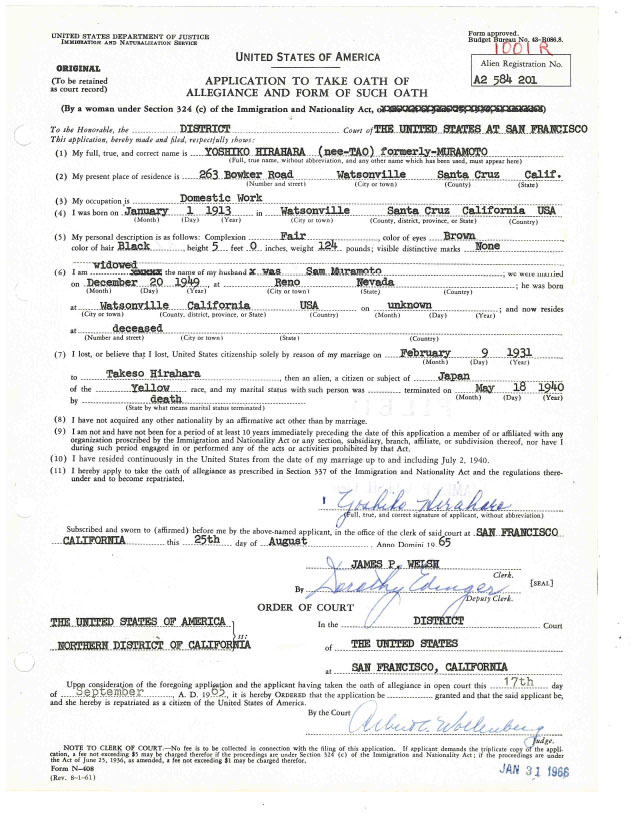 After the war, Yoshiko married again, to Sam Muramoto in 1949, and was widowed again when he died in 1963. In 1952, the Immigration and Nationality Act, for the first time in American history, removed all racial and marriage restrictions to naturalized citizenship. More than a decade later, in 1965, Yoshiko, using her first married name and listing her occupation as domestic work, filed a repatriation form with the Immigration and Naturalization Service, to take an oath of allegiance to regain the American citizenship she had been born with and lost for thirty-four years.